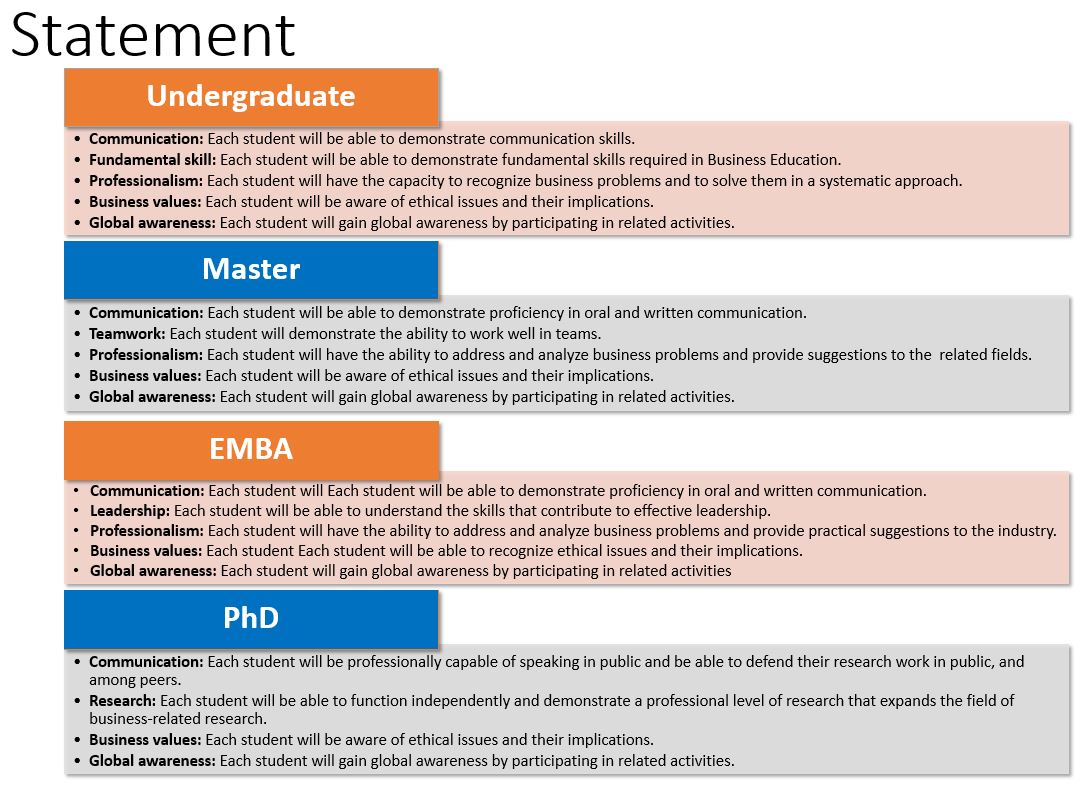 Mission:Commit to teaching, research, and business practice integration and aim to foster professionals and business leaders with global perspectives and sustainability mindset for enterprises.