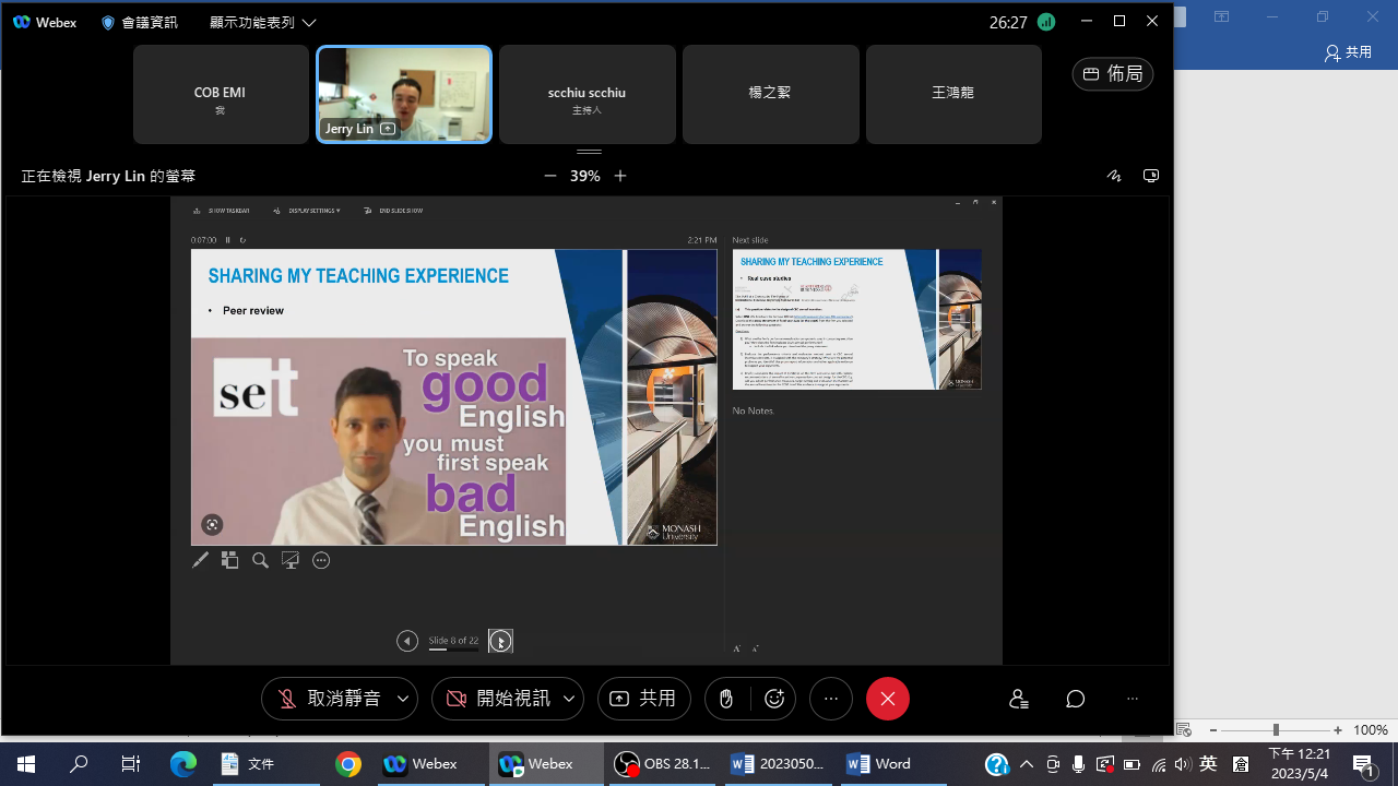 2023/05/04 商學院EMI社群活動 - 雙語教學經驗分享 講者: 澳洲蒙納許大學林易宏老師 |