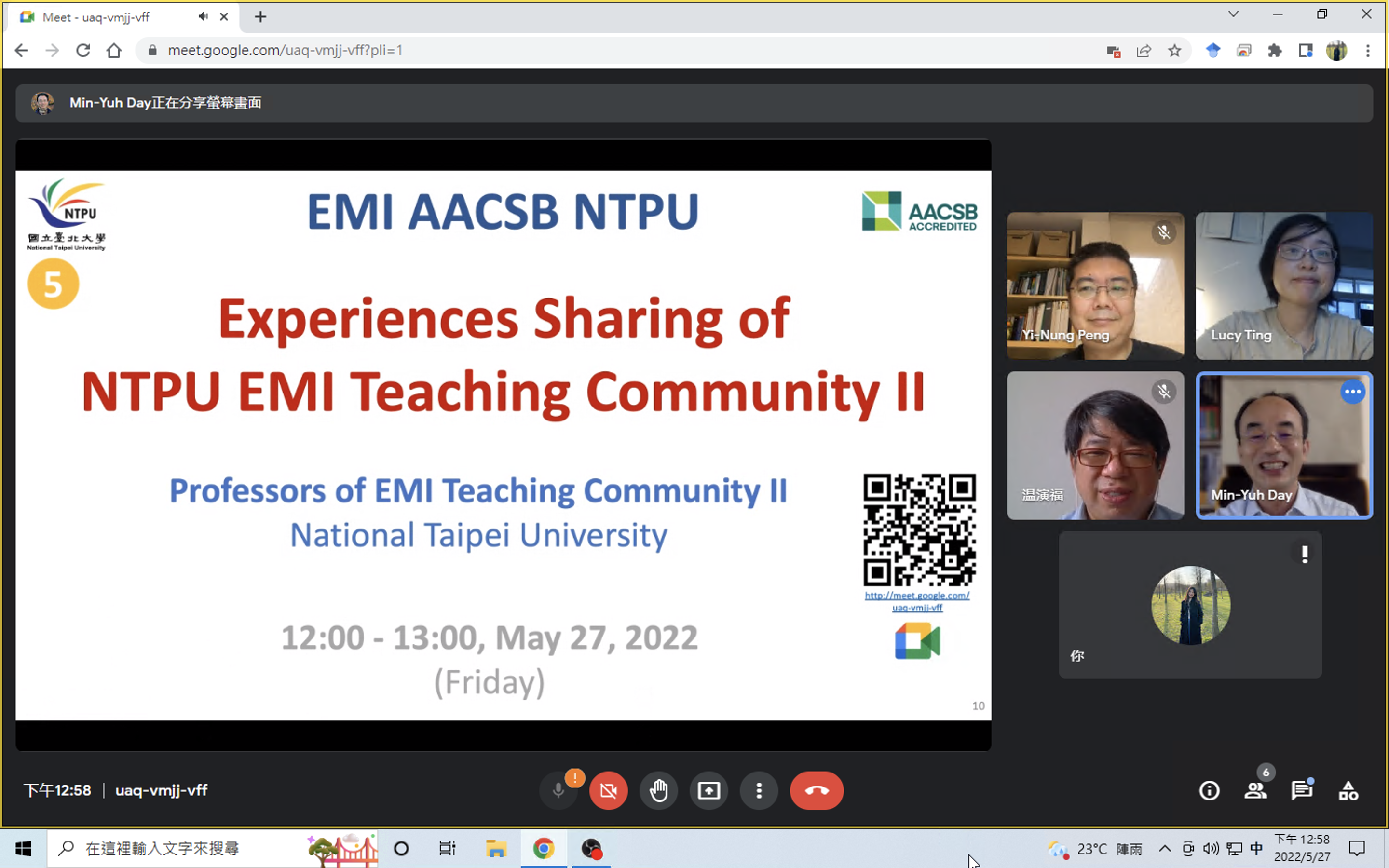 2022/05/27 Experience Sharing of NTPU EMI Teaching Community II (社群二教師) 講者: 戴敏育教授、彭奕農教授、丁姵如教授、溫演福教授 |