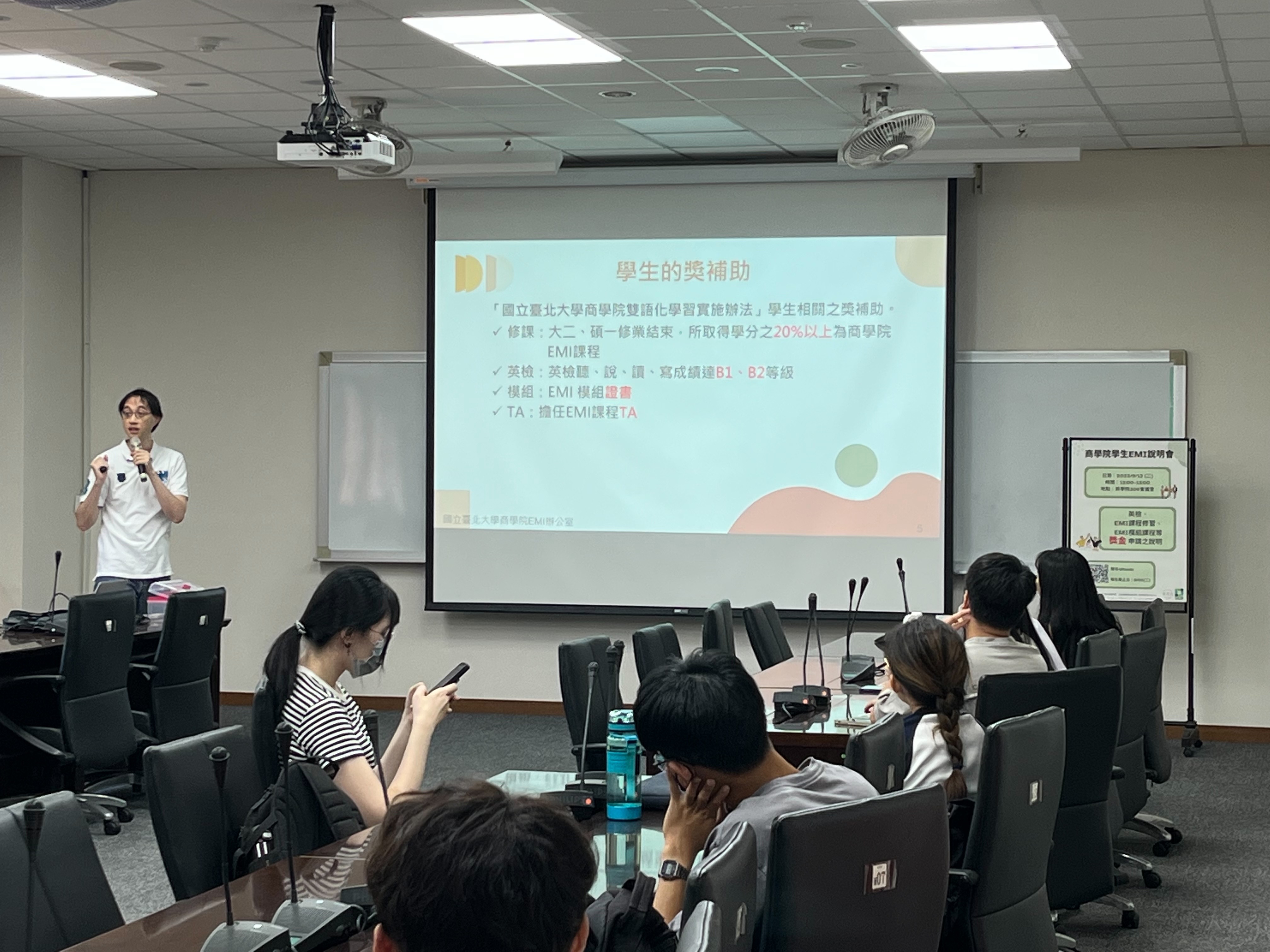 2023/09/12 EMI學生說明會 雙語化學習計畫執行長說明雙語計畫之背景,以及商學院於此計畫下提供予學生的獎補助、申請時程、與申請之注意事項。 |