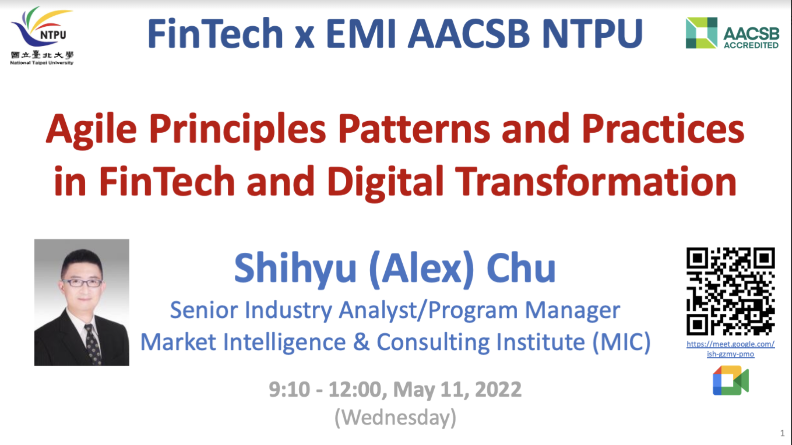 2022/05/11 EMI 教師社群活動: Agile Principles Patterns and Practices in FinTech and Digital Transformation 講者: 市場情報中心 朱師右經理 |