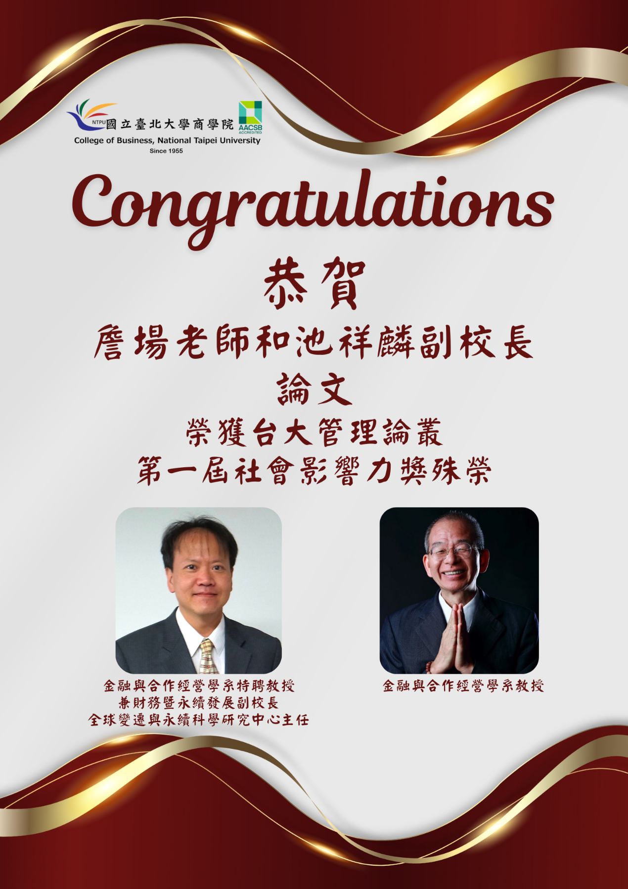 Congratulations to Professor Chang Chan of the Department of Finance and Cooperative Management and Vice President for Finance and Sustainable Development Hsiang-Lin Chih, for receiving the 1st Social Impact Award from NTU Management Review for their co-authored paper: