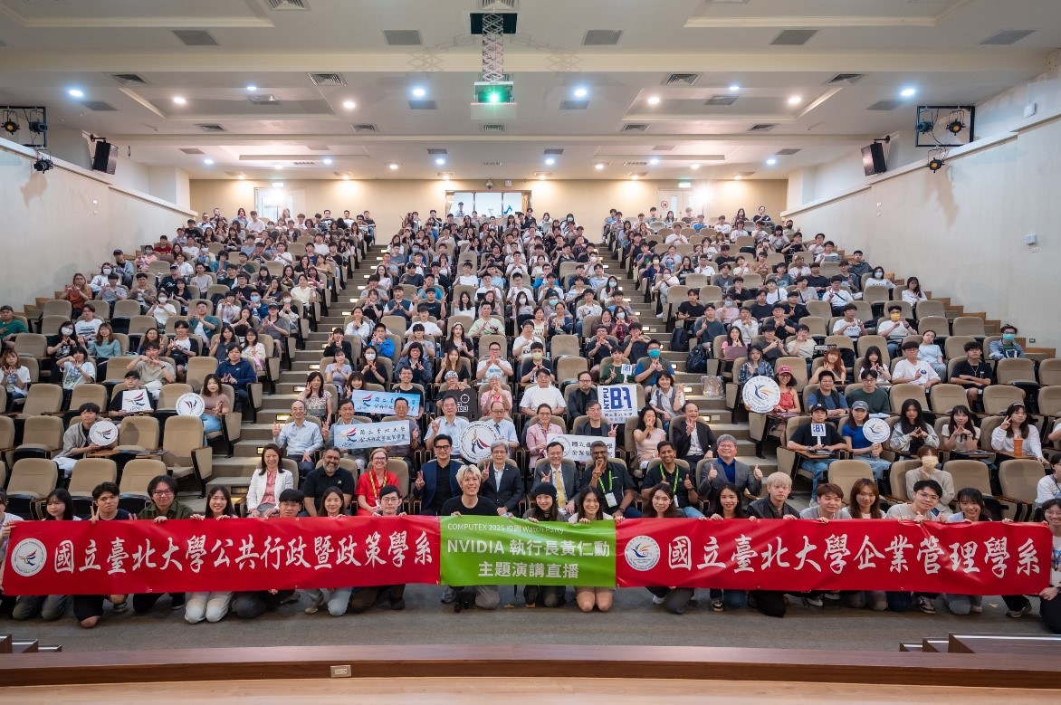 On May 19, 2025, National Taipei University hosted a campus Watch Party for NVIDIA CEO Jensen Huang’s keynote speech at COMPUTEX 2025, held at the College of Business International Conference Hall. Co-organized by the Department of Public Administration and the Department of Business Administration, the event drew over 400 participants, with all seats filled shortly after registration opened, reflecting the campus community’s keen interest in AI and future technologies.