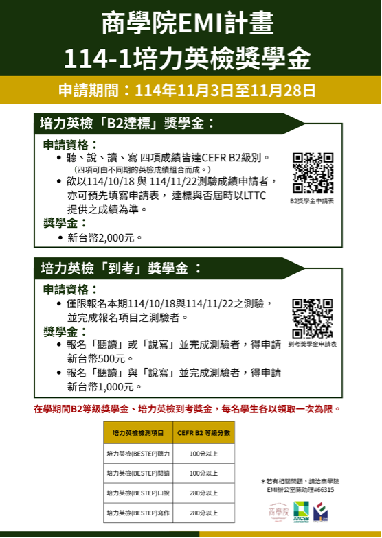 The College of Business EMI Program 114-1 Academic Year Student English BESTEP Scholarship is now open for applications until November 28th!
