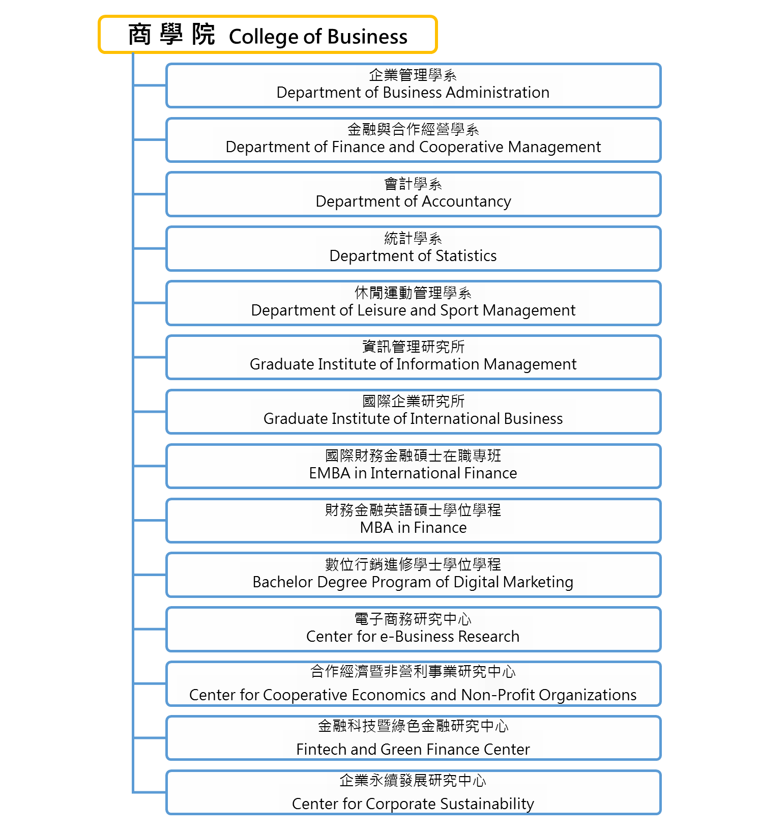 商學院承襲原本法商學院企業管理、合作經濟、會計、統計等四個學系的優良傳統,改制後陸續擴展學術領域,成立休閒運動與管理學系、資訊管理研究所、國際企業研究所、國際財務金融碩士在職專班,以及四個研究中心,合作經濟學系更名為金融與合作經營學系,近幾年成立財務金融英語碩士學位學程、數位行銷進修學士學位學程,藉由不斷蛻變,為本校創造更亮眼的學術地位。