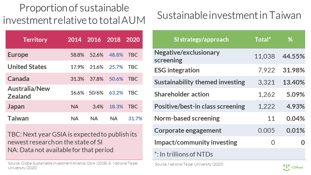 The survey results revealed that the share of SRI in AUM is 31.7% in Taiwan. The insurance industry accounts for NT$12 trillion, government funds account for NT$1 trillion, and securities investment trust and consulting companies account for NT$0.6 trillion. The team explained that the relatively small amount of sustainable investment by securities investment trust and consulting companies appears to be related to their less willingness to fill their sustainable assets. In the future, the team will communicate with these companies, hoping that the survey results will reflect Taiwan sustainable investment practices.