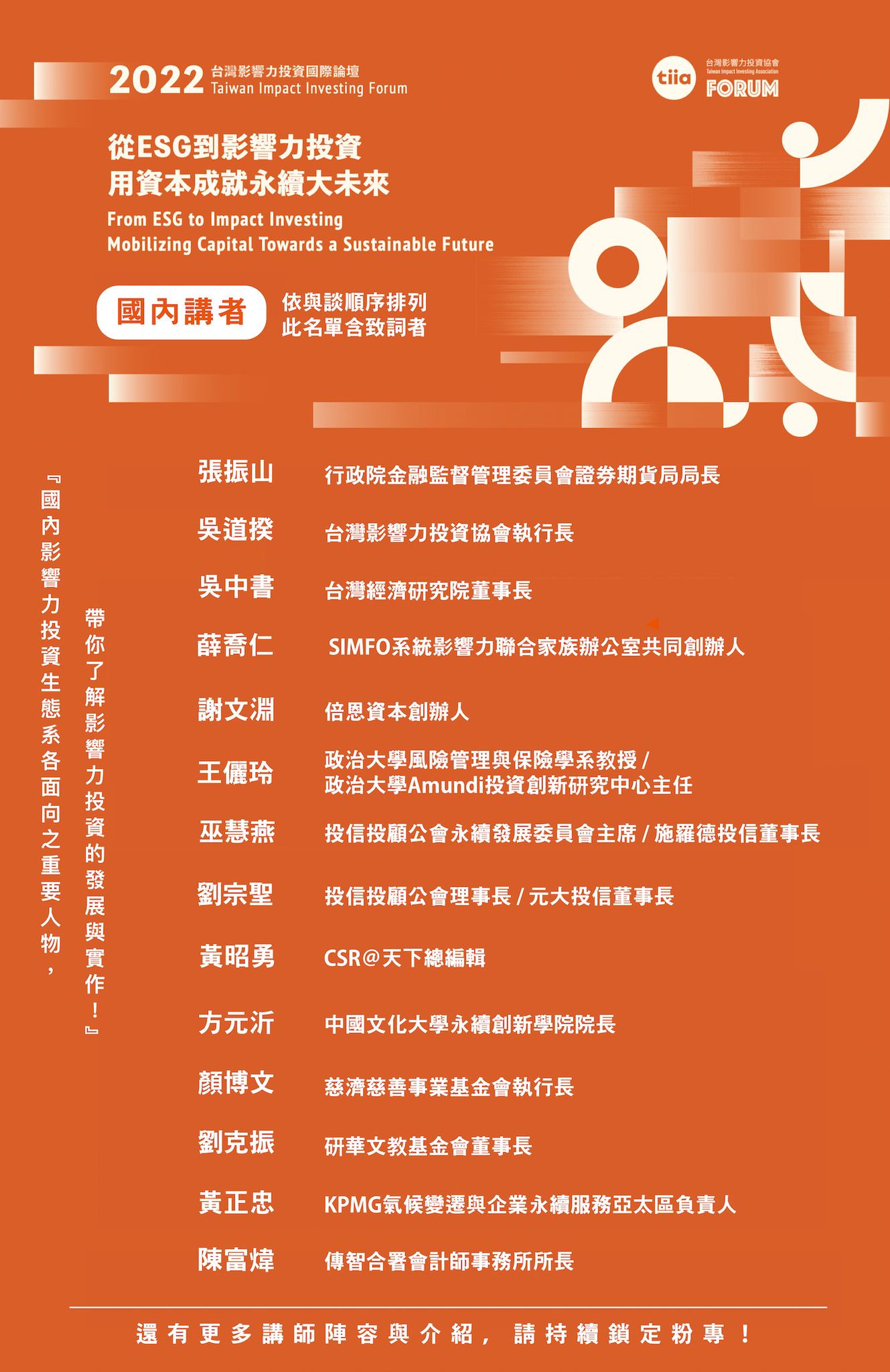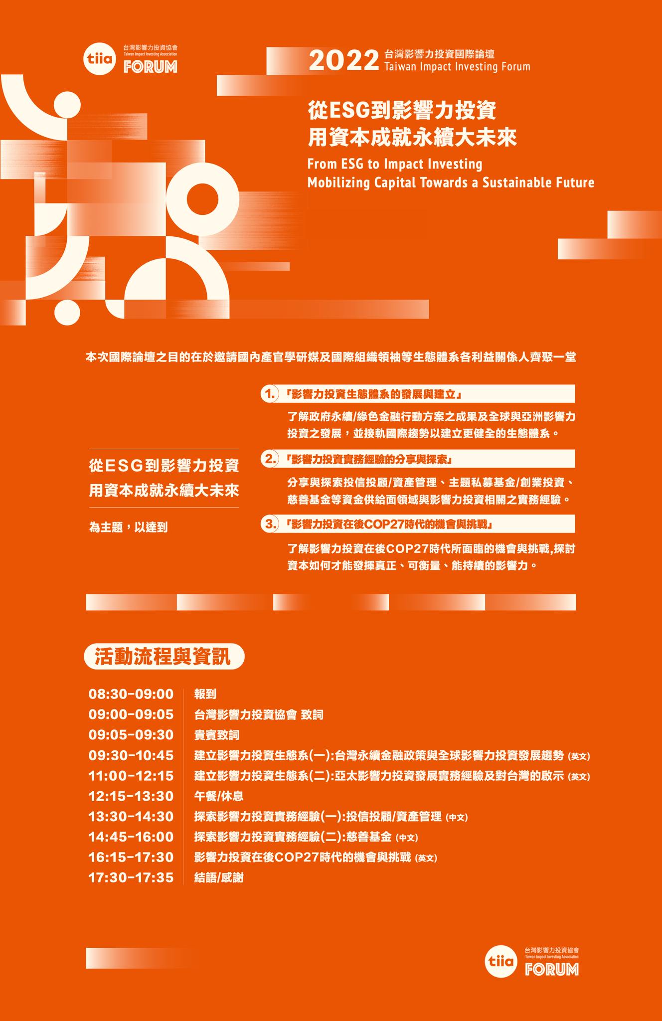 議程說明:論壇聚焦ESG評鑑與責任投資,從企業與消費者角度探討永續轉型策略,並交流全球投資新趨勢。