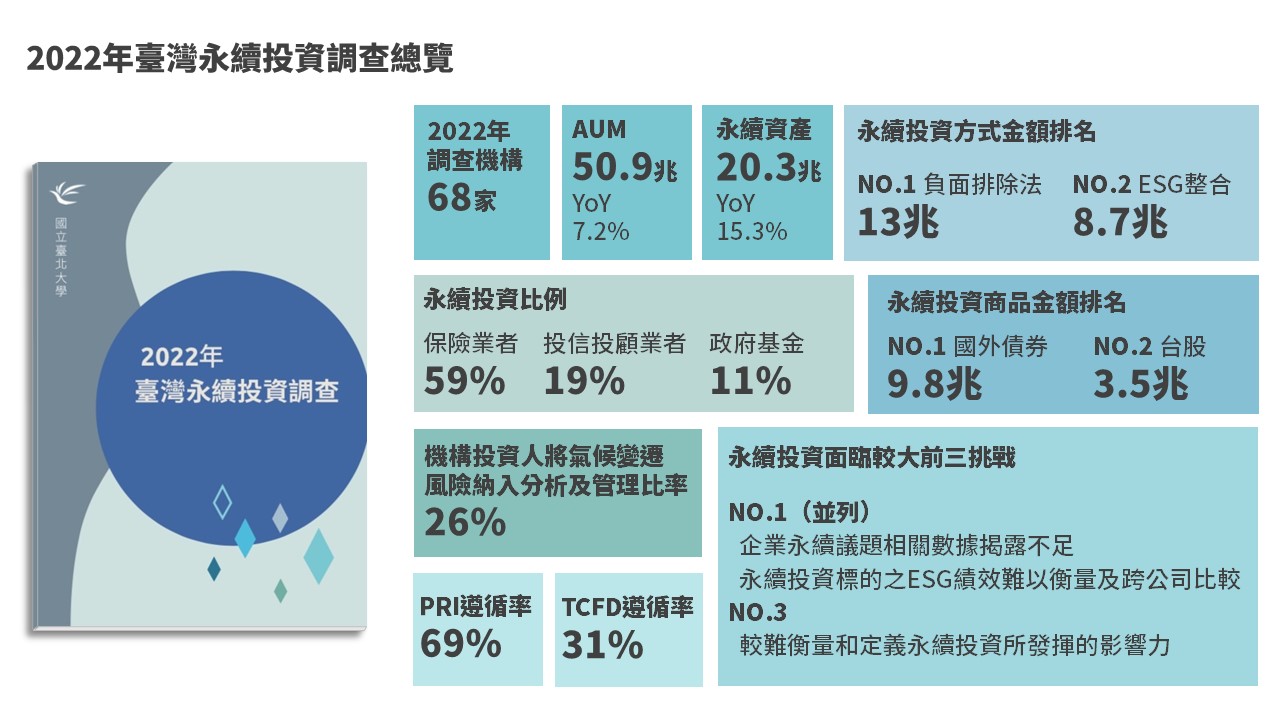 調查資產總額(AUM)總計約新臺幣51.3 兆元,年成長8.2%;永續投資資產總計新臺幣20.3兆元,年成長15% ;永續投資比例提升為39.6% (高過去年的37%) 。與此同時,進行永續投資的機構投資人比率為73%,整體情形與去年略同。臺灣保險業者(壽險與產險)永續資產達約新臺幣17.2兆元,投信投顧達新臺幣1.5兆元,政府基金達新臺幣1.5兆元,皆有所成長。保險業與政府基金之永續投資比例皆上升。