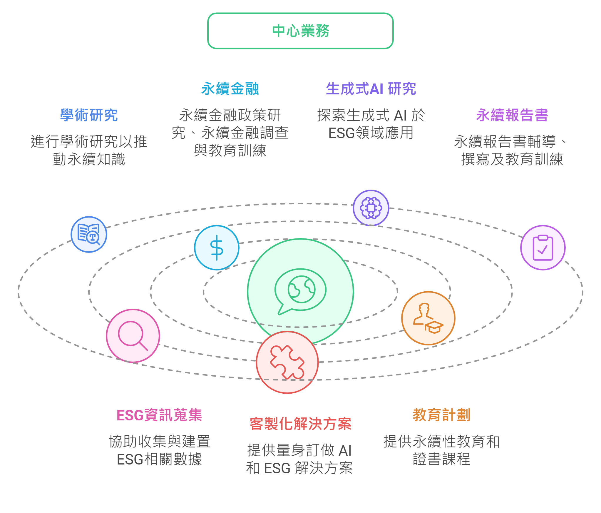中心業務包含:學術研究、永續金融、生成式AI 研究、永續報告書、ESG資訊蒐集、客製化解決方案、教育計劃等
