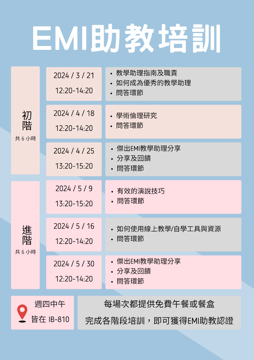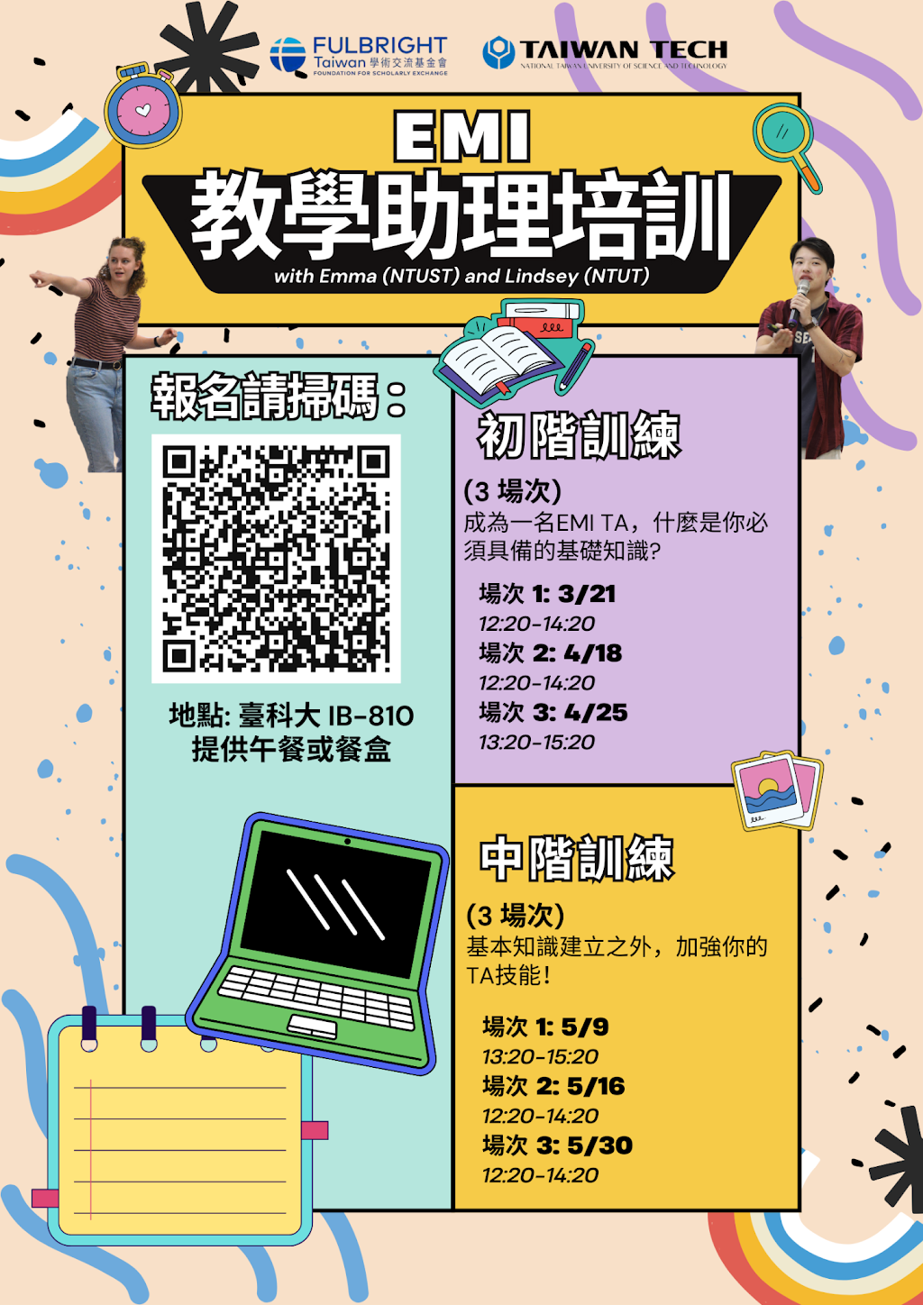 (一)國立臺灣科技大學EMI教學資源中心與Fulbright Taiwan學術交流基金會EMI顧問團隊,聯手舉辦EMI教學助理培訓活動,由Fulbright EMI 英語教學協同人員-Emma 及Lindsey帶領教學助理們,從基礎、進階到實務應用,共12小時的基礎知識及進階技能,將有趣的構想導入課堂活動,讓你的教學及學習資源更加豐富,完成培訓後,帶著堅實的自信成為EMI教學助理!