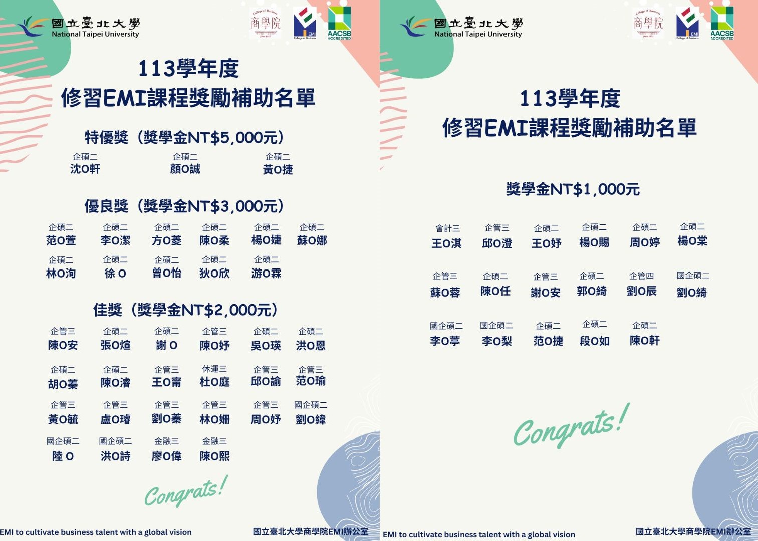 【公告】 「113學年度修習EMI課程獎勵補助獲獎名單」