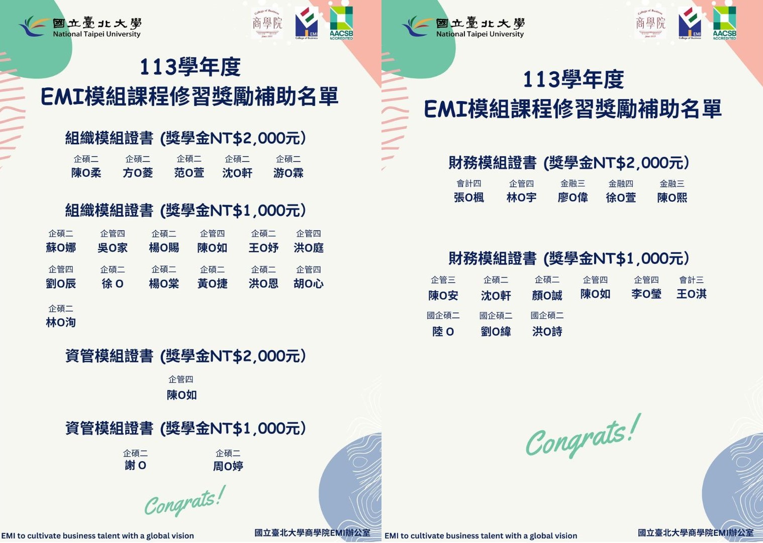 【公告】 「113學年度EMI模組課程修習證書名單」
