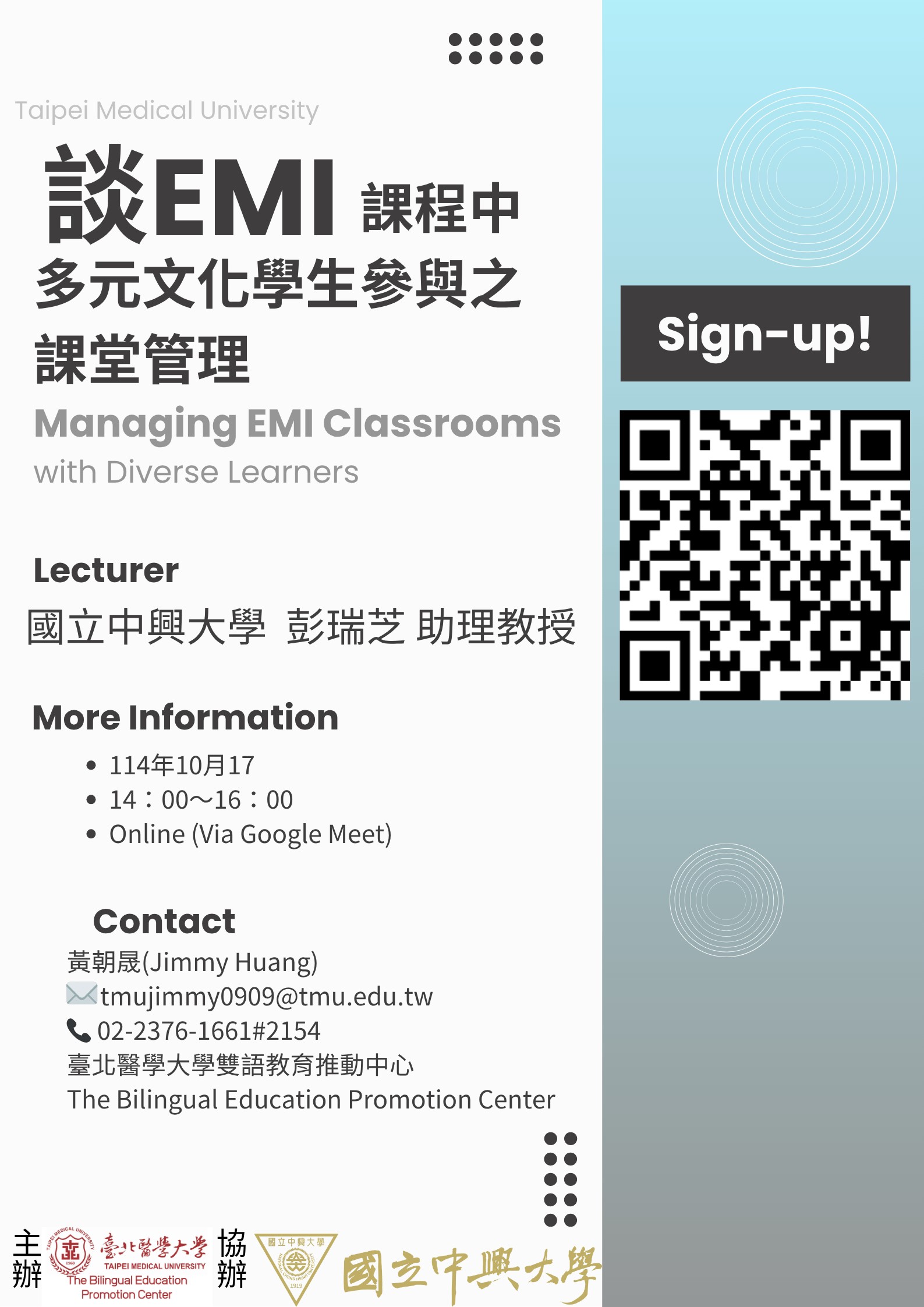 (一)主題: EMI教師培訓增能講座「談EMI課程中多元文化學生參與之課堂管理」