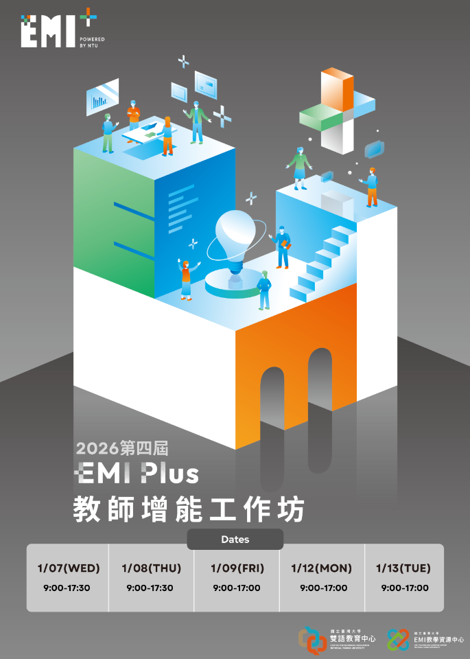一、旨揭工作坊為EMI增能課程,由不同專業領域之教師,於5日的工作坊中(合計36小時)傳授各式增能主題,例如:BOPPPS教學法、EMI課室困境與解方及互動式數位工具應用等,並導入「前後測」作為評量,以清楚呈現增能成效。 通過評量者,將獲國立臺灣大學EMI教學資源中心頒發的「結訓證明」與ISW國際認證(Instructional Skills Workshop)的結業證書,詳細資訊請參閱附件議程。